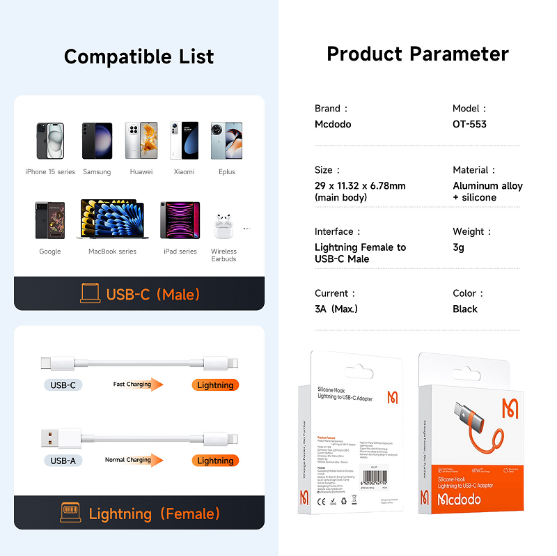 Mcdodo OT-553 Lightning to USB-C PD Adapter Support:60W [Order Model: MCD-OT5530]